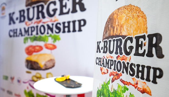 둘째 날인 4월 9일(목)에는 전시장 한켠이 또 다른 열기로 가득 찼어요. 2026 코리아버거챔피언십(KBC) 결선이 펼쳐졌거든요. 치열한 예선에서 살아남은 버거 브랜드 6팀과 세미파이널을 통과한 2팀이 바로 이 무대에서 한국적인 맛을 담아낸 비프버거를 선보이는 결전의 순간이었는데요.