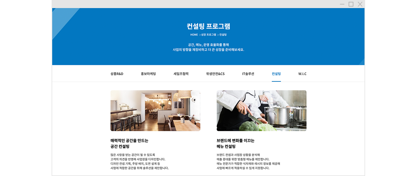 끝으로, 컨설팅을 통해 고객의 의견을 반영하고, 사업에 적합한 공간을 위한 솔루션을 제안합니다. 브랜드 컨셉과 사업장 상황을 분석해 매출 증대를 위한 맞춤형 메뉴를 제안하고 메뉴 전문가가 적합한 식자재와 레시피 정보를 제공해 사업에 빠르게 적용할 수 있도록 지원하고 있습니다. 사업장 손익을 효과적으로 개선할 수 있도록 기존 조리 과정을 단계별로 분석하고 운영 전문가가 직접 현장을 방문해 코칭하는 등 다양한 개선 방법을 자세히 알려드리고 있습니다.