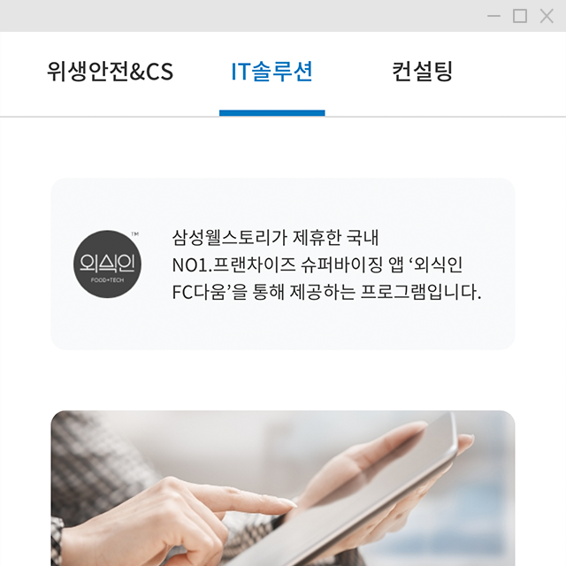 가장 먼저, 상품 개발 측면에서 삼성웰스토리의 노하우를 담아 다각도의 도움을 드리고 있는데요. 전국 어느 매장에서도 변치 않는 맛을 제공할 수 있는 해당 프랜차이즈 전용 상품 개발과 조리를 간편하게 만드는 효율화 상품 개발을 통해 매장 운영을 더 편리하게 돕고 있요. 또한, 새로운 기회를 열어주는 밀키트, 간편식 상품 개발을 통해 매출 증대에 도움이 되는 아이디어를 찾아내고 새로운 상품을 지속적으로 제안하고 있답니다.