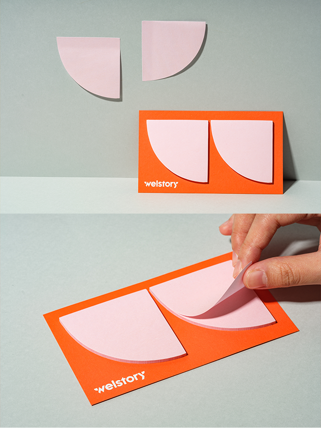 웰스토리의 브랜드 로고를 가장 직관적으로 반영한 아이템은 바로 포스트잇이에요. 한 장씩 뜯어 쓸 때마다, 프로들의 스토리가 만들어진다는 의미를 담았어요.